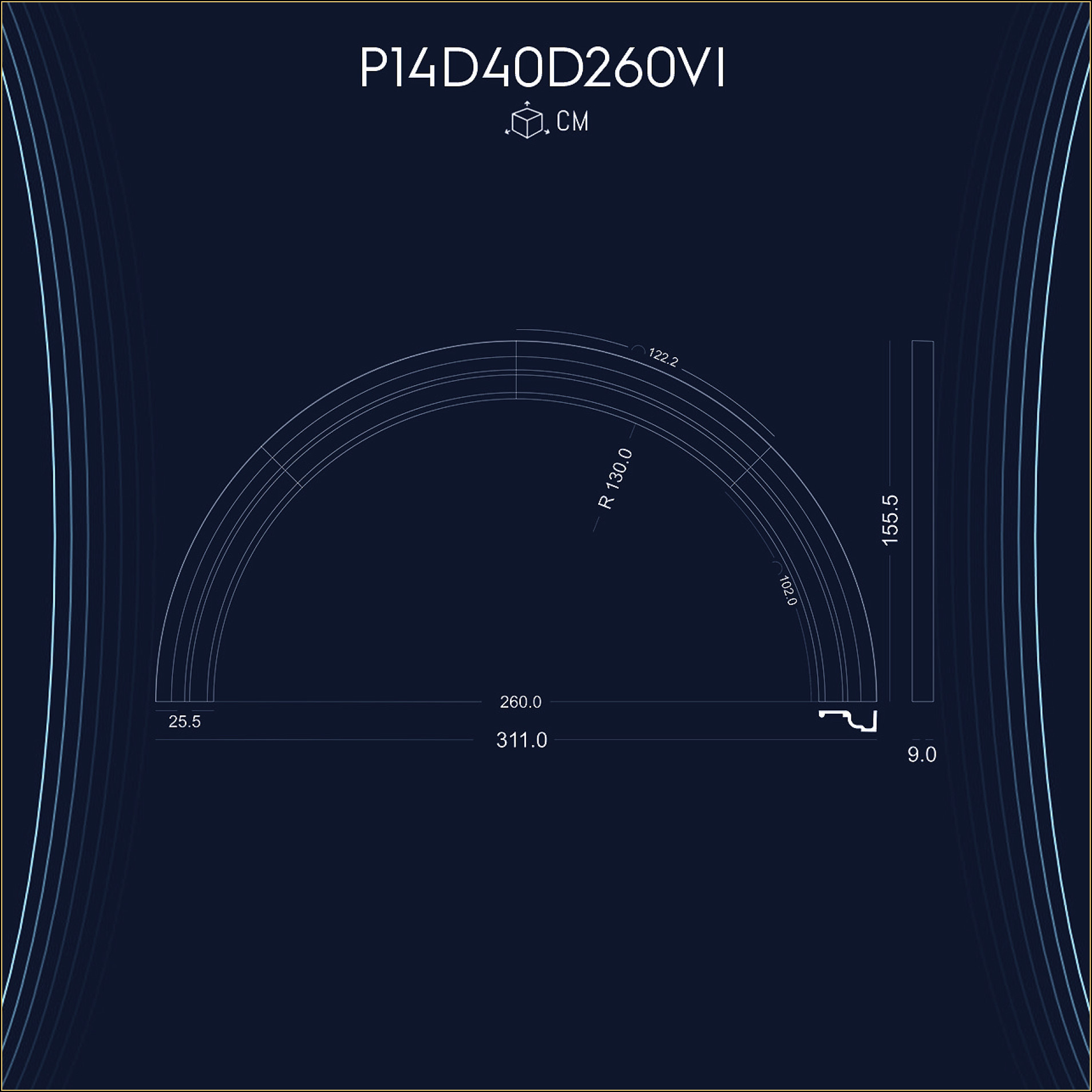 P14D25D100VI Decoratiune din poliuretan pentru margine exterior de perete cu arcada semirotunda.